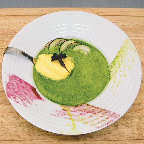 Готовим суп-пюре из шпината на телячьем бульоне с соусом из куркумы и маракуйи, нежный и мягкий по вкусу.