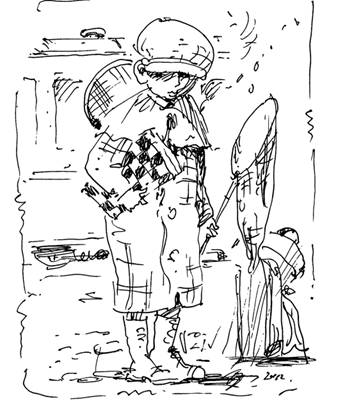 …На перроне — элегантная дама в модной шляпе, с мальчиком лет восьми. Он выглядит типичным путешествующим англичанином: инвернесский плащ с пелериной, кепи и высокие ботинки кордовской кожи. Шахматная доска — под мышкой, за спиной — теннисная ракетка и сачок.